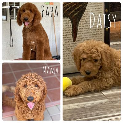 Daisy has whelped 2 litters, of 7 & 8 healthy puppies: of various colors: black, cream & apricot. She has proven to be an excellent Mother, caring for her puppies from birth well past our expectations post weaning. We chose a smaller stud for Daisy to bring forth mid-size Godlendoodles which we expected to range from 45-55 lbs.